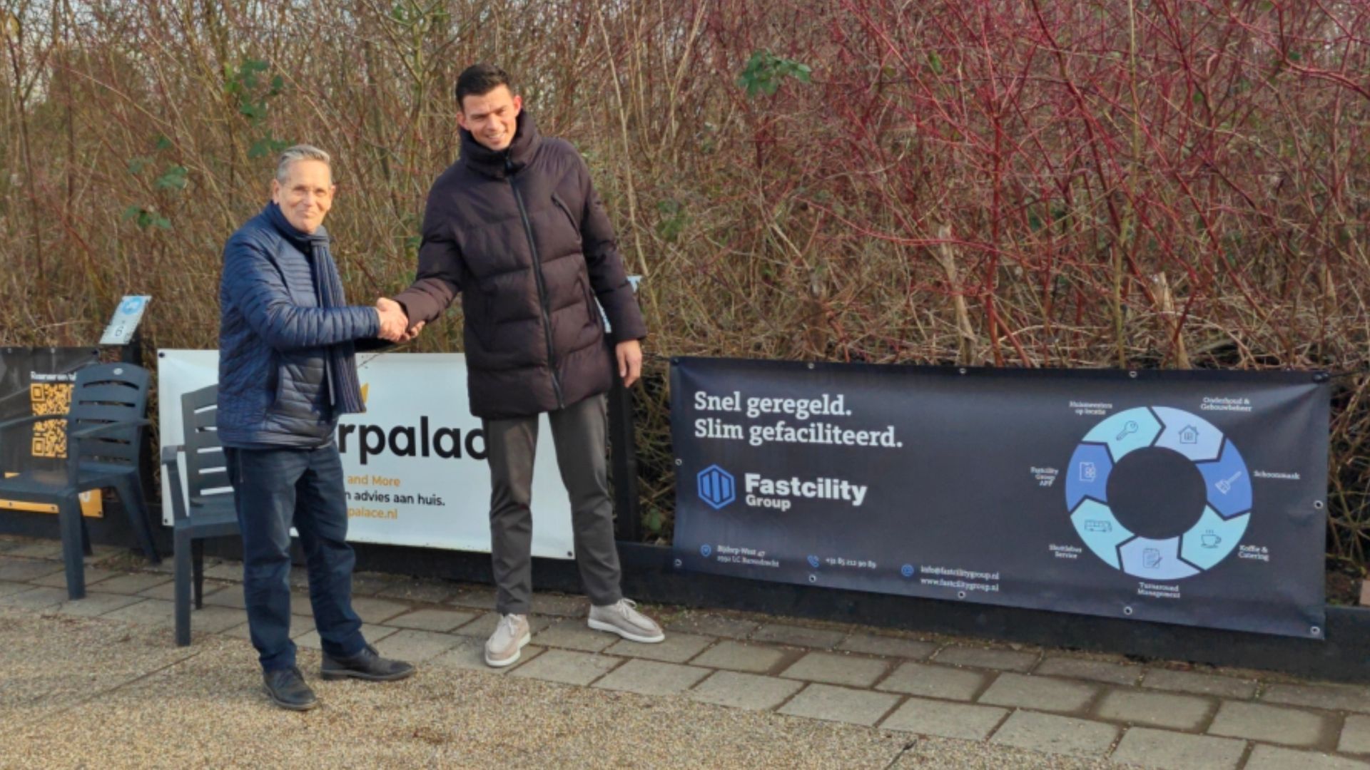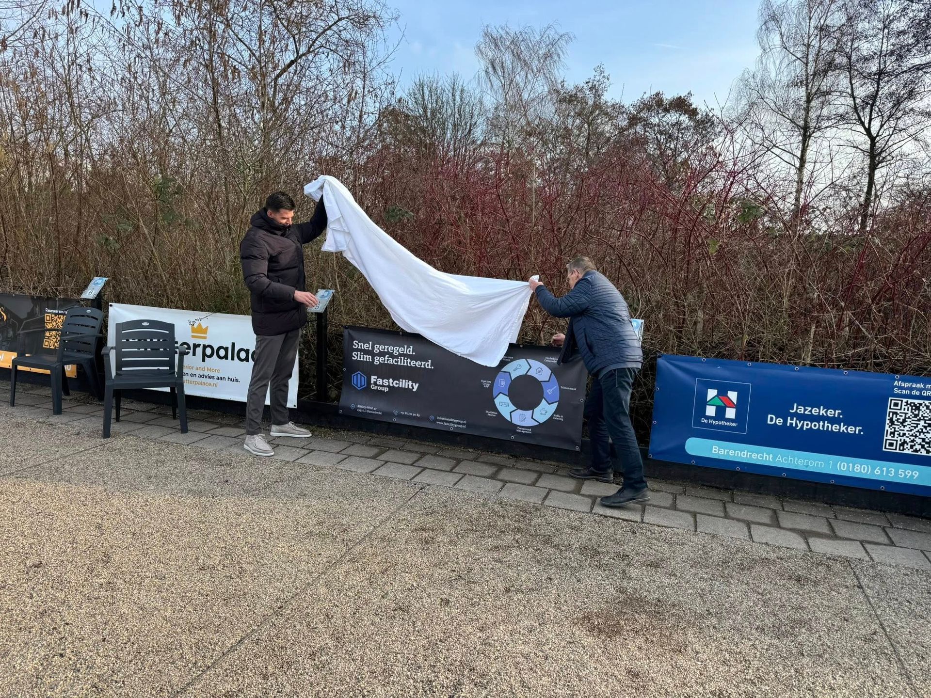 Tijdens een korte bijeenkomst werd het nieuwe spandoek feestelijk onthuld. De Jeu de Boules Club Barendrecht is blij met de samenwerking en kijkt uit naar een langdurige en succesvolle relatie met Fastcility Group.