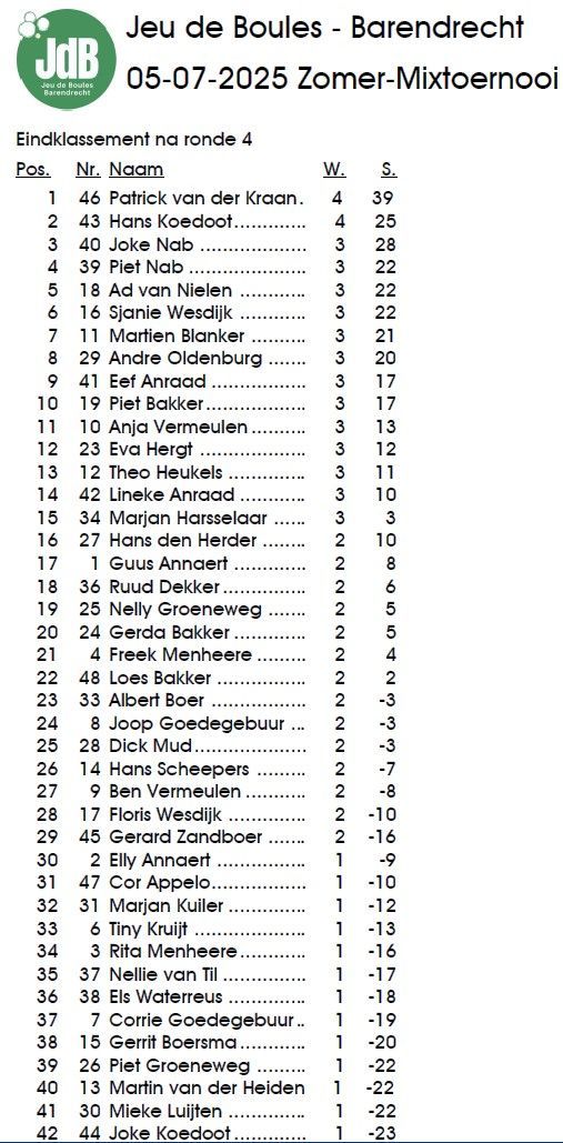 Op zaterdag 5 juli stond ons sfeervolle complex van Jeu de Boules Barendrecht in het teken van het jaarlijkse Zomermixtoernooi. Het deelnemersveld was dit keer wat kleiner dan gebruikelijk, met 44 spelers, maar dat deed niets af aan het enthousiasme en het spelplezier!